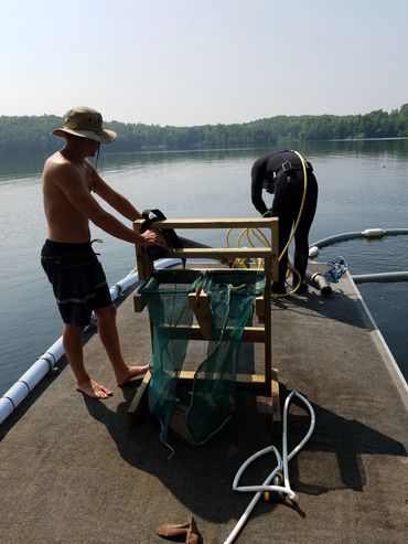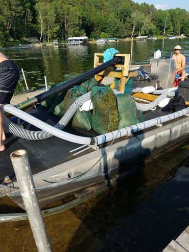 Aquatic Plant Management (APM) removed Eurasian Watermilfoil, using the diver assisted suction system, on July 8, 2019. They cleared one heavy spot on the southwest shore, but spent most of their time by the Wild Rose Resort boat landing. They removed 12 bags, holding about 3 cubic feet in each bag. (Photos curtesy of Gus Nordholm)