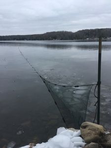 The nets are to catch baby bass. The baby bass run into the mesh floating along the reeds and follow it to the net, where they swim through (but the big bass do not fit). The baby bass are taken away and the big bass are left behind. Each netting structure costs between $1000 - $1500. One of the DNR guys spends his winter free time sewing closed the holes in the nets - by hand. They installed around 20 of these structures on Roberts today.